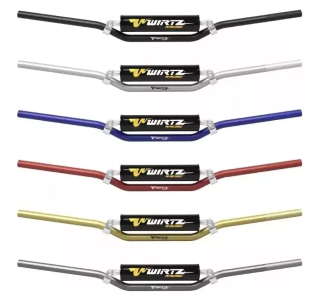Pack Wirtz El pack Incluye: - MANUBRIO WIRTZ X6 (22mm) - ELEVADORES WIRTZ, DISPONIBLES EN LAS SIGUIENTES MEDIDAS +25/+35/+45mm - JUEGO DE PUÑOS WIRTZ *MEDIDAS DE LOS MANUBRIOS WIRTZ: -Medidas Manubrio Wirtz X6 ALTO (HI): Largo 800mm, Alto 105mm, Sweep 105mm -Medias Manubrio Wirtz X6 BAJO (LOW): Largo 820mm, Alto 90mm, Sweep 95mm *CARACTERÍSTICAS Y BENEFICIOS DE LOS MANUBRIOS WIRTZ: -Los manubrios Wirtz están construidos con una aleación especial de aluminio y templados con los procesos mas modernos del mercado. -Los manubrios Wirtz son los únicos en el mercado con la particularidad de tener un espesor variable en su interior para lograr una rigidez optima (Pared de 6mm en su interior, Pared de 4mm en los extremos, asegurando Flexibilidad, Reducir Vibración y apto para la instalación de cualquier cubre manos. -Los manubrios Wirtz están construidos en su 100% de Aluminio, siendo mas livianos que el original de caño 40% mas resistentes que el original de caño. -Anodizado: un proceso de anodizado de 15 pasos forma un recubrimiento integral que brinda protección contra la corrosión -Alta resistencia al impacto, ligero y excelente amortiguación de vibraciones.