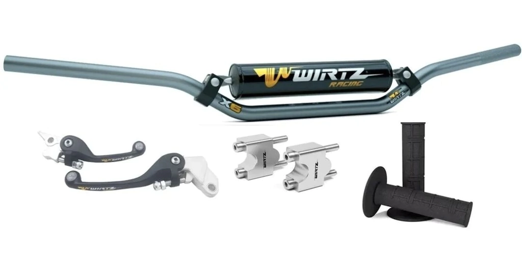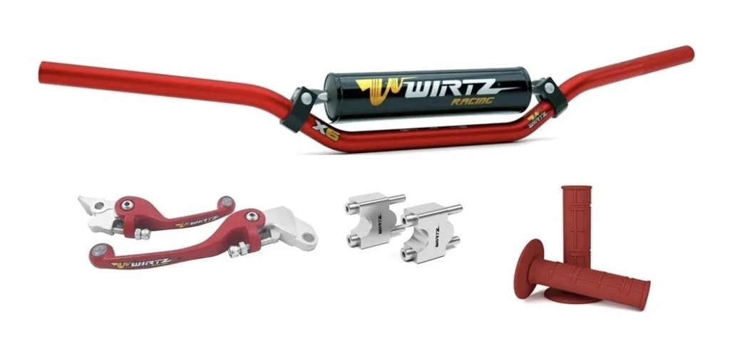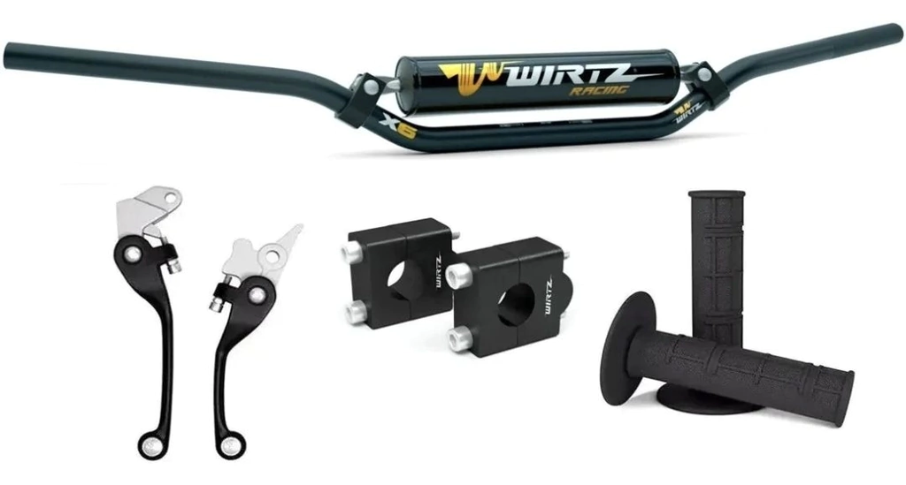 YaPack Wirtz El pack Incluye: - MANUBRIO WIRTZ X6 (22mm) - ELEVADORES WIRTZ, DISPONIBLES EN LAS SIGUIENTES MEDIDAS +25/+35/+45mm - SET DE PALANCAS REBATIBLES WIRTZ - JUEGO DE PUÑOS WIRTZ *MEDIDAS DE LOS MANUBRIOS WIRTZ: -Medidas Manubrio Wirtz X6 ALTO (HI): Largo 800mm, Alto 105mm, Sweep 105mm -Medias Manubrio Wirtz X6 BAJO (LOW): Largo 820mm, Alto 90mm, Sweep 95mm *CARACTERÍSTICAS Y BENEFICIOS DE LOS MANUBRIOS WIRTZ: -Los manubrios Wirtz están construidos con una aleación especial de aluminio y templados con los procesos mas modernos del mercado. -Los manubrios Wirtz son los únicos en el mercado con la particularidad de tener un espesor variable en su interior para lograr una rigidez optima (Pared de 6mm en su interior, Pared de 4mm en los extremos, asegurando Flexibilidad, Reducir Vibración y apto para la instalación de cualquier cubre manos. -Los manubrios Wirtz están construidos en su 100% de Aluminio, siendo mas livianos que el original de caño 40% mas resistentes que el original de caño. -Anodizado: un proceso de anodizado de 15 pasos forma un recubrimiento integral que brinda protección contra la corrosión -Alta resistencia al impacto, ligero y excelente amortiguación de vibraciones. *PODES ARMAR TU PACK PERSONALIZADO CAMBIANDO LOS COLORES DE CADA COSA. SOLO CONSULTANOS LAS DISPONIBILIDADES • DIFERENTES LINEAS DE MANUBRIOS WIRTZ RACING: - X1 Manubrio de Aluminio de 22mm diametro, incluye Travesaño. - X6 Manubrio de Aluminio de 22mm Diametro, incluye Travesaño, Pad Inyectado con Vinilo. - WR5 Naked Manubrio de Aluminio tipo Fatbar 28mm Diametro en la base, 22mm en los extremos. - WR5 Manubrio de Aluminio tipo Fatbar 28mm Diametro en la base, 22mm en los extremos, Incluye Pad Inyectado con Vinilo. - W3D Manubrio de Aluminio tipo Fatbar 28mm Diametro en la base, 22mm en los extremos, Incluye Travesaño, Pad Inyectado con Vinilo.